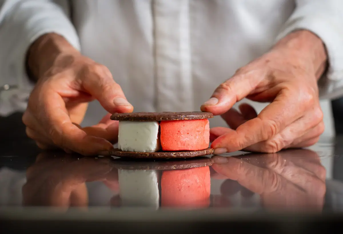 Oltre a questi si aggiungono anche “I-Conico”, un cono gelato senza vuoti e riempito con 5 diverse consistenze che si alternano dalla cima al fondo e “Diametro 7”, nuova interpretazione del biscotto. Un numero che oltre a far riferimento al diametro dei due dischi circolari utilizzati, si rifà all’idea pitagorica del 7 come simbolo di evoluzione e cambiamento. Tre sono i diversi gusci che Ferrara ha studiato: biscotto frolla, biscotto savoiardo e brioche, in modo da avere diverse consistenze al morso.