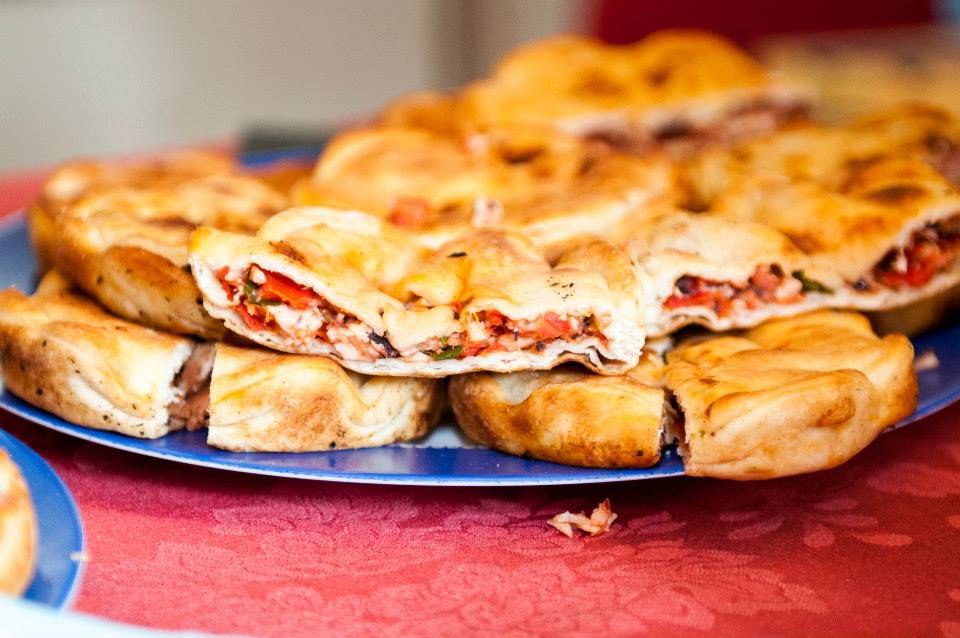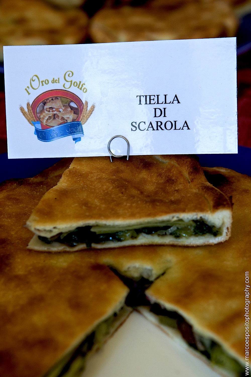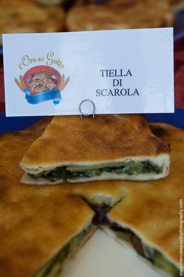 - TIELLE DI GAETA Azienda “L’Oro Del Golfo”, Tielle fresche e surgelate artigianali di Mario Frostino > La modernità sposa la Tradizione La tiella è una specialità gastronomica tipica della città di Gaeta, consistente nell’interporre un ripieno di vario genere (solitamente di prodotti della terra o del mare) tra due sfoglie di pasta simile a quella della pizza, ma che richiede una lavorazione più accurata e possibilmente manuale. In altri termini la tiella si potrebbe definire come una sorta di ripieno tra due strati circolari di pasta morbida, umida nel ripieno ma non eccessivamente nello strato esterno. La tiella nasce come piatto unico gradito a contadini e pescatori per consentire loro di avere una pietanza che si conservasse per diversi giorni. Si racconta che già ai tempi dei Borbone alcuni di essi ne fossero estimatori; successivamente la sua memoria si lega al consumo di gaetani che partivano per emigrare in cerca di fortuna. Ai tempi nostri la tiella rappresenta una specialità apprezzata da tutti e ricercata da turisti e abitanti delle città limitrofe, una pietanza che molti cercano di imitare o di proporre nelle varie pizzerie, ristoranti e attività commerciali e di somministrazione alimentare, ma che pochi (solitamente le massaie) riescono a creare nel migliore dei modi. La tradizione vuole la tiella ripiena di: polpi, calamaretti, scarola, spinaci e baccalà, zucchine, cipolle, alici, cozze ed altre varianti. Si dice che il segreto di una buona tiella sia l’olio prodotto con olive di Gaeta il quale, come solevano dire le passate generazioni, deve scorrere fino ai gomiti, cosa che ai tempi odierni non è sicuramente possibile, per motivi di dieta, igiene e costo del prodotto. Come preparare un tiella Tiella di scarola: – 500 gr di farina – 500 gr di scarola – 100 gr di olive nere snocciolate – 50 gr di capperi – olio, prezzemolo, sale, peperoncino forte Tagliuzzare finemente la scarola, cospargerla di sale e metterla a cuocere per 15minuti. Schiacciare la verdura così preparata ben bene con le mani per eliminare tutta l’acqua che contiene e condirla con olio, peperoncino forte, prezzemolo, olive, capperi, con l’aggiunta, per chi lo gradisce, 150 gr di baccalà diliscato e tagliato a pezzi grossolani.